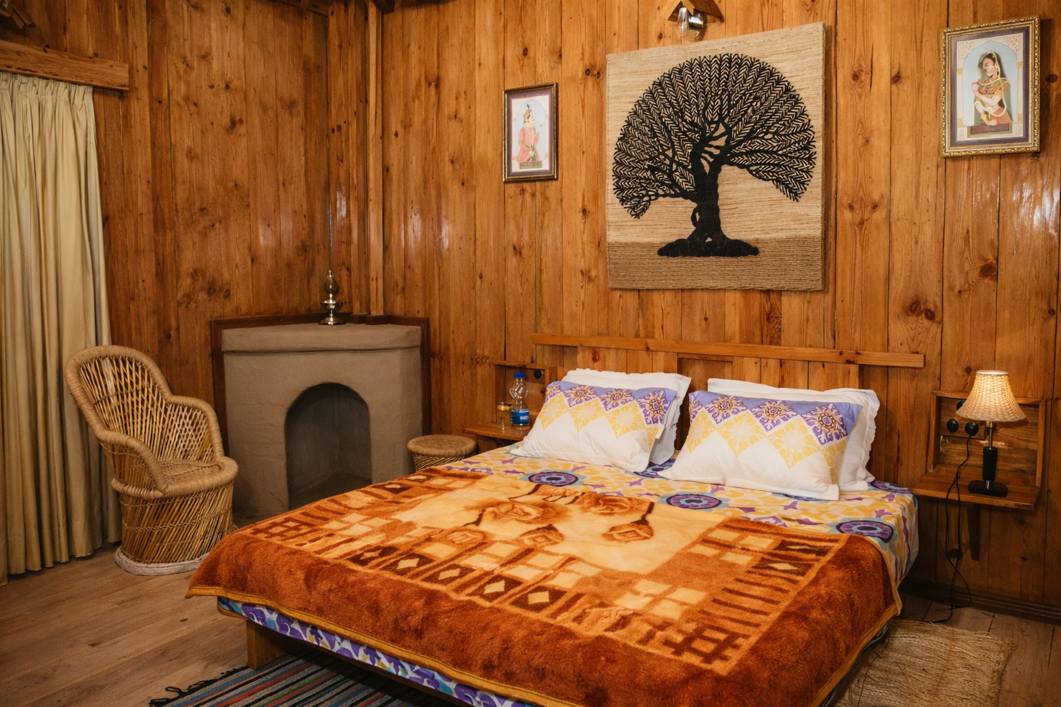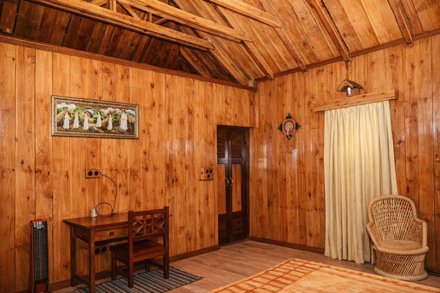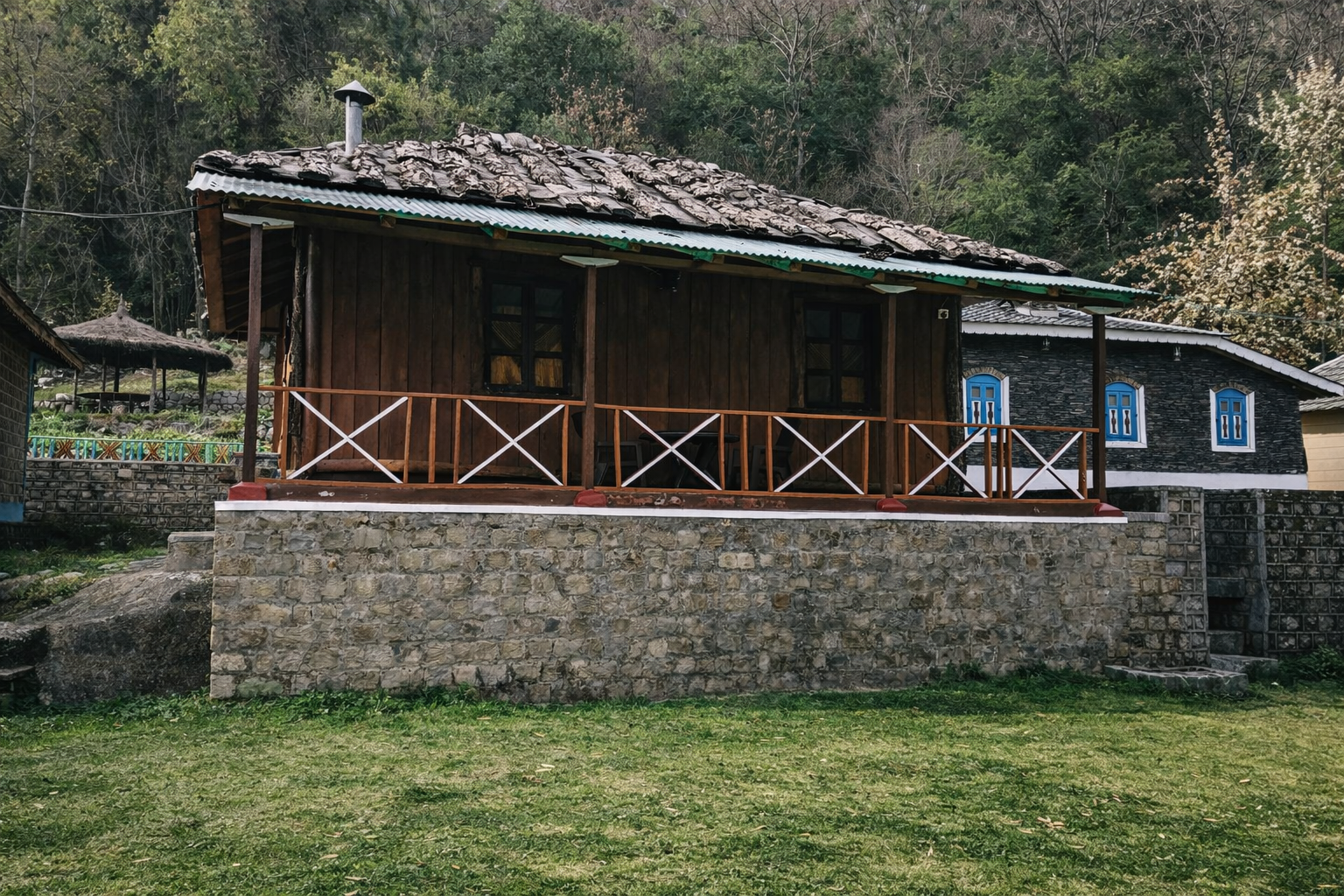 Barot Cottage Barot is single bed room wooden cottage. Walls and flooring are of local wooden pine. It has a single bedroom with “fire place”, changing room, bathroom, open “Angan” on front and “Veranda” at rear.