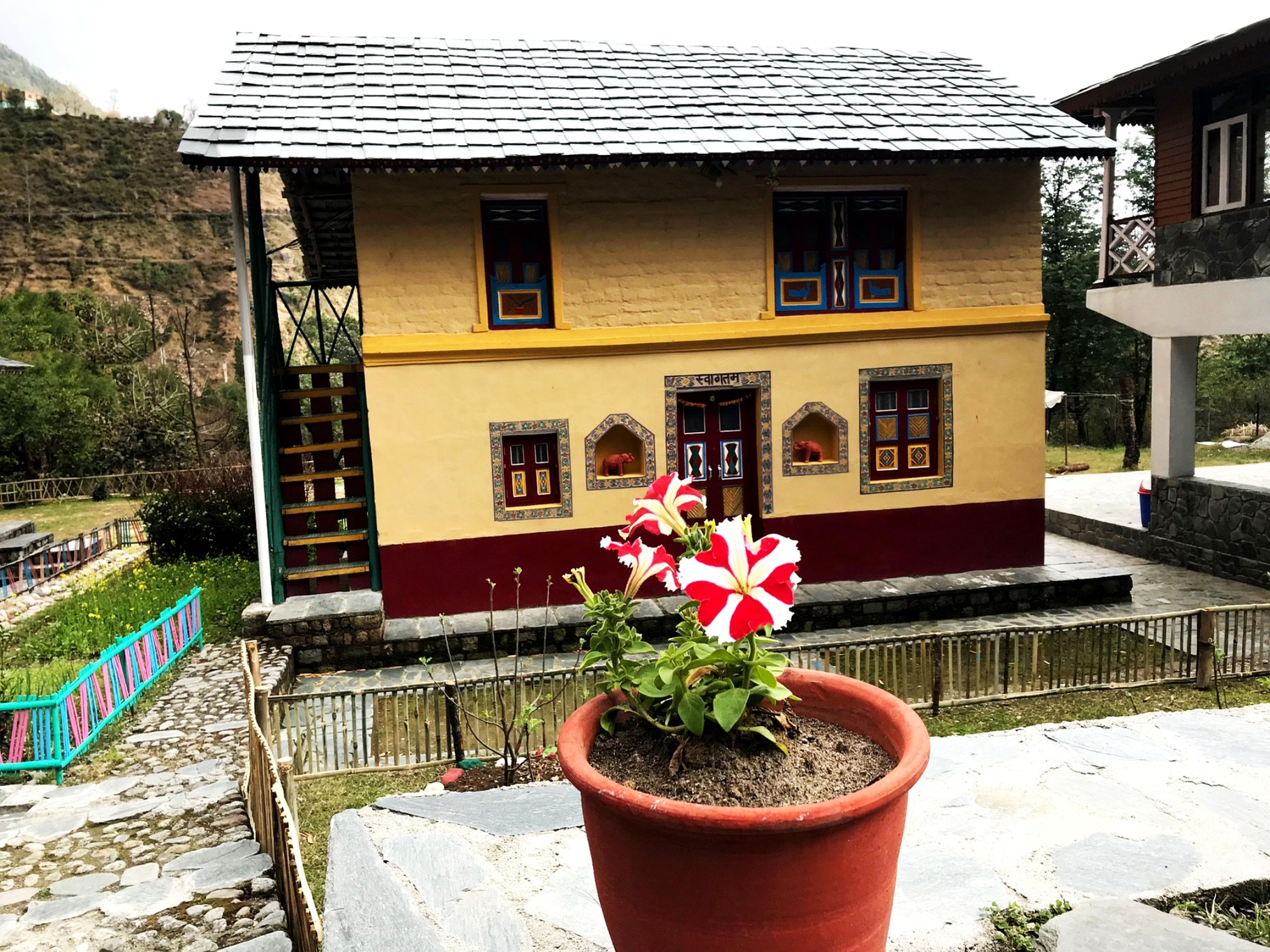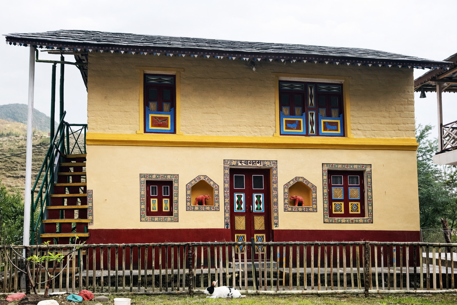 It is a double storey two bed room mud house. Walls are of hand made sun dried mud bricks with mud plaster, roofing is of local bamboos and slates. One bedroom in ground floor with changing room, bathroom and veranda at rear. Stairs from outside goes to second room in 1st floor with changing room, bathroom and “varanda” at rear.
